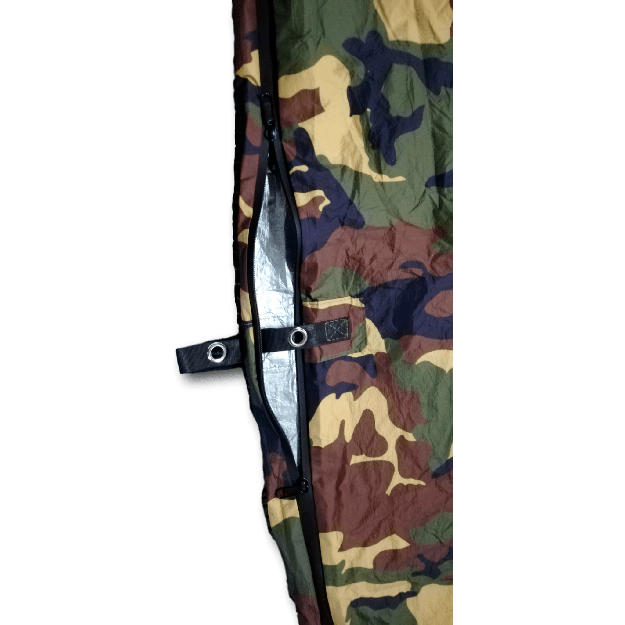 Then we added two zippers with an inside and outside zipper for even more flexibility and ease of zipping the BIVVY once inside. The inside has an aluminum coating to reflect back the radiant heat given off by one's body.